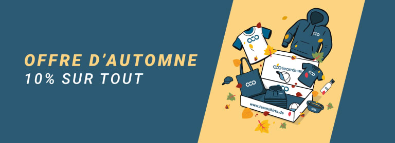 *Valable jusqu’au 30/11/25 uniquement sur www.teamshirt.fr. Minimum d’achat : 50 €. Offre non cumulable. Ne s'applique pas aux achats de cartes cadeaux et de sérigraphie produits. Les prix dégressifs s’appliquent au préalable.